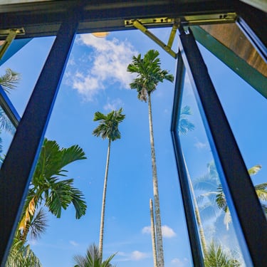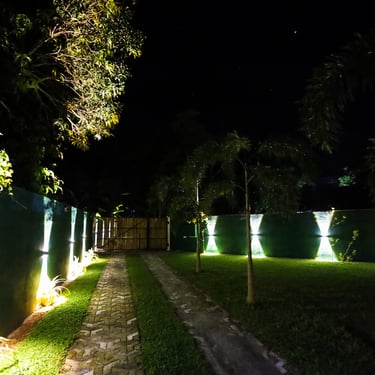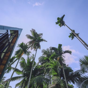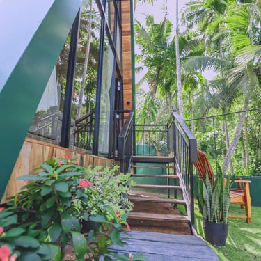 The greenish tones of the house blend beautifully with the tropical landscape. With warm sunlight during the day and gentle breeze in the evening, the place feels like a little slice of heaven-simple natural and full of quiet joy.