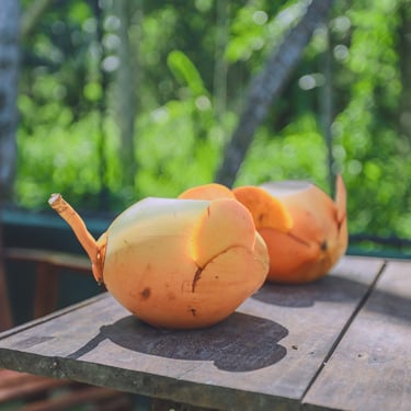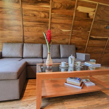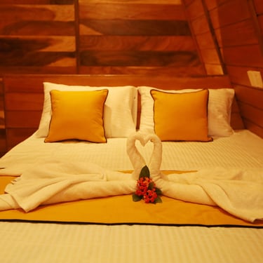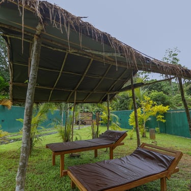 This small A-frame wooden cabana is a peaceful hideaway in the heart of tropical country. Surrounded by lush green trees and plants, the environment is calm, cool and filled with sunshine. It’s the perfect spot for two people looking to relax and enjoy nature.