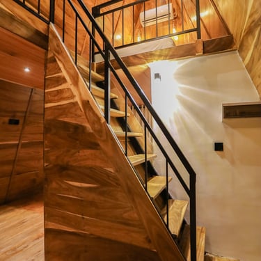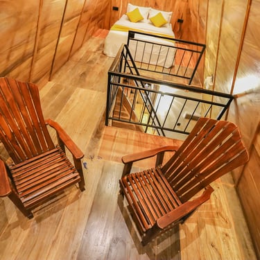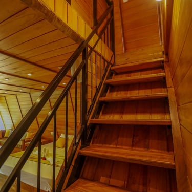 At the top, a small upstairs balcony offers a perfect view of the vibrant surroundings. Warm sunshine filters through the leaves, casting golden patterns on the floor. The air is cool and fresh, filled with the gentle sound of birds shining from every direction. Their melodies create a peaceful rhythm that flows through the day, soothing the mind and spirit.