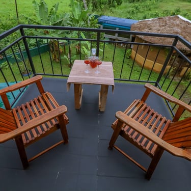 The cabana has a cozy upstairs area; with a small inside balcony that opens to views greenery all around. Birds sing sweet melodies from the branches, while chipmunks play nearby, adding life and charm to the peaceful setting.